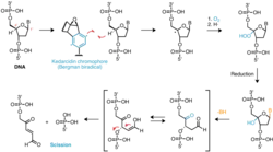 Le mécanisme commun à tous les antibiotiques énédiyniques repose sur la cyclisation de Bergman, dans laquelle la portion énédiynique subit une cycloaromatisation spontanée générant un biradical de type para-benzyne, hautement réactif vis-à-vis de l’abstraction homolytique d’un hydrogène depuis des donneurs appropriés, notamment les sucres désoxyribose de l’ADN. Cette abstraction génère un radical libre centré sur un atome de carbone de l’ADN, qui est ensuite oxydé par l’oxygène moléculaire. Le peroxyde résultant se décompose, provoquant des cassures simple ou double brin dans l’ADN, ce qui entraîne finalement la mort cellulaire[6].