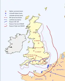 Au début de la bataille d'Angleterre, le Fighter Command compte 58 escadrons répartis dans quatre groupes de chasseurs. Outre le No. 11 Group RAF de Park et le No. 12 Group RAF de Leigh-Mallory, ceux-ci comprennent le No. 10 Group RAF (en) qui couvre le sud-ouest de l'Angleterre, et le No. 13 Group RAF qui couvre le nord de l'Angleterre et l'Écosse. Responsable de la zone sud-est de l'Angleterre, y compris de Londres, le No. 11 Group RAF doit faire face au gros des forces aériennes de la Luftwaffe, soit au moins 1 000 bombardiers et 400 chasseurs. Pour y faire face, Park dispose de 350 chasseurs répartis dans 22 escadrons de chasse et d'un peu plus de 550 pilotes. Il peut également faire appel aux groupes voisins pour obtenir des renforts si nécessaire[74],[75]. Park ordonne que les escadrons de chasse sous son contrôle soient lancés contre les bombardiers allemands en approche dans le but de les attaquer avant qu'ils n'atteignent leurs cibles, et qu'il faut éviter d'engager des escortes de chasseurs[76],[77].