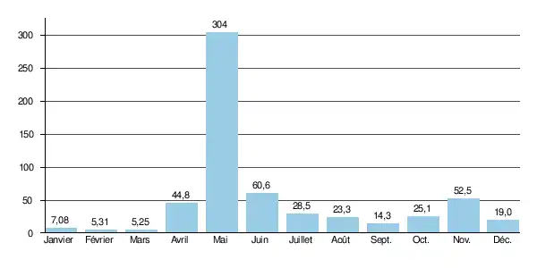 Le débit moyen mensuel observé en mars (minimum d'étiage) est de 5,25 m3/s, soit moins de 2 % du débit moyen du mois de mai (304 m3/s), ce qui souligne l'amplitude extrêmement importante des variations saisonnières. Ces écarts de débit mensuel peuvent être plus marqués encore d'après les années : sur la durée d'observation de 38 ans, le débit mensuel minimal a été de 0,32 m3/s en , tandis que le débit mensuel maximal s'élevait à 652 m3/s en . Et ces chiffres sont loin d'être exceptionnels.