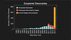 - ↑ « Welcome to the NASA Exoplanet Archive » [archive], exoplanetarchive.ipac.caltech.edu, (consulté le ) : « 13 février 2014: The Kepler project has updated dispositions for 534 KOIs in the Q1-Q16 KOI activity table. This brings the total number of Kepler candidates and confirmed planets to 3,841. For more information, see the Purpose of KOI Table document and the interactive tables. »
