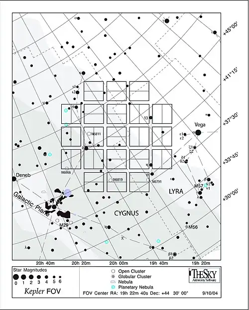 Durant la mission primaire Kepler observe en permanence les étoiles de la même région de l'espace située dans l'hémisphère nord, non loin des constellations du Cygne, de la Lyre et du Dragon dans le bras spiral d'Orion de la Voie Lactée (cf schéma et photo ci contre). Cette région de l'espace a été choisie parce que compte tenu de son élévation au-dessus du plan de l'écliptique elle est observable tout au long de l'année sans que la lumière du Soleil pénètre dans le télescope. Par ailleurs elle comporte un nombre suffisamment important d'étoiles similaires à notre Soleil pour permettre de remplir les objectifs assignés à la mission. Sa position dans le ciel permet de limiter la taille du pare-soleil de manière qu'elle soit compatible avec le volume disponible sous la coiffe du lanceur utilisé pour placer Kepler en orbite. Compte tenu de ces critères deux régions de l'espace restaient éligibles l'une dans l'hémisphère nord, l'autre dans l'hémisphère sud. L'hémisphère nord a été privilégiée pour faciliter les observations faites depuis des observatoires terrestres (plus nombreux dans cet hémisphère) destinées à confirmer l'existence des exoplanètes. Le champ d'observation du télescope de Kepler couvre 115 degrés carrés, soit environ 0,28 % du ciel. La majeure partie des étoiles de la région de l'espace observée se trouvent à une distance comprise entre 600 et 3 000 années-lumière (au-delà de cette distance, la détection d'une planète de la taille de la Terre n'est pas possible). Moins de 1 % d'entre elles se trouvent à moins de 600 années-lumière[31].