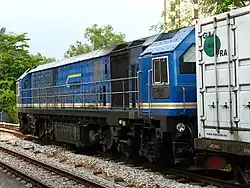 Intercité tractée par une locomotive diesel sur la voie unique au nord de Singapour.