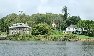 Stone Store, littéralement la « boutique de pierre », est le plus ancien bâtiment en pierre de Nouvelle-Zélande et le plus ancien bâtiment commercial du pays[1],[5]. Le Stone Store est construit entre 1832 et 1836 dans un style georgien, à partir de basalte local et de grès importé d'Australie. Composé de deux étages surmontés d'une mansarde, il s'agit à l'origine d'un entrepôt de la Church Mission Society. Situé à proximité de la côte, il permettait notamment de stocker les produits importés. En 1893, le bâtiment est vendu par la Church Mission Society à la famille Kemp. Par la suite, il change souvent d'affectation : école, poste et boutique[5].