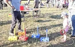 Kermesse lancer d'anneaux - Le lancer d'anneaux: Le but est de lancer un ou plusieurs anneaux horizontalement autour d'un piquet maintenu ou planté sur un axe vertical.