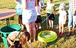 - La pêche aux canards: Le but est d'attraper un ou plusieurs objets flottants dans un petit bac ou petite piscine contenant de l'eau. Sous l'objet se trouve un numéro ou une couleur qui permet d'obtenir un ou plusieurs lots à échanger au stand des lots.