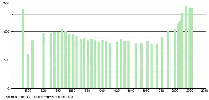 L'évolution du nombre d'habitants est connue à travers les recensements de la population effectués dans la commune depuis 1793. Pour les communes de moins de 10 000 habitants, une enquête de recensement portant sur toute la population est réalisée tous les cinq ans, les populations de référence des années intermédiaires étant quant à elles estimées par interpolation ou extrapolation[27]. Pour la commune, le premier recensement exhaustif entrant dans le cadre du nouveau dispositif a été réalisé en 2004[28].