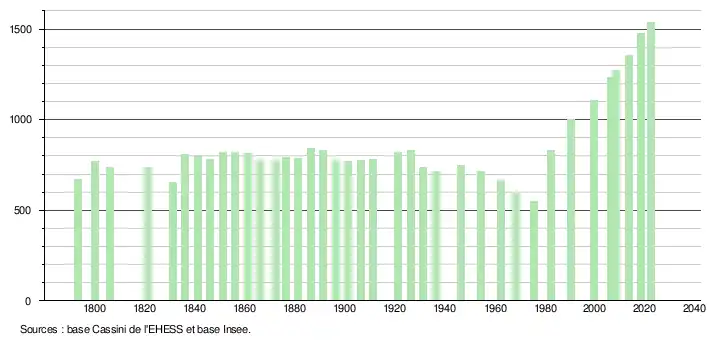 L'évolution du nombre d'habitants est connue à travers les recensements de la population effectués dans la commune depuis 1793. Pour les communes de moins de 10 000 habitants, une enquête de recensement portant sur toute la population est réalisée tous les cinq ans, les populations de référence des années intermédiaires étant quant à elles estimées par interpolation ou extrapolation[24]. Pour la commune, le premier recensement exhaustif entrant dans le cadre du nouveau dispositif a été réalisé en 2008[25].