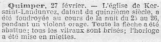 « La flèche du clocher de Notre Dame de Bon Secours de Ksaint en Landunvez a été abattue par la foudre le 23 Février 1903. Continuant l’œuvre de Mme BAZIL, qui avit racheté cette chapelle Collégiale pendant la Révolution, pour en faire don à la fabrique de Landunvez en 1810, sa famille a pris à sa charge la reconstruction de la flèche. Elle a été rétablie telle qu'elle existait avant l'accident.