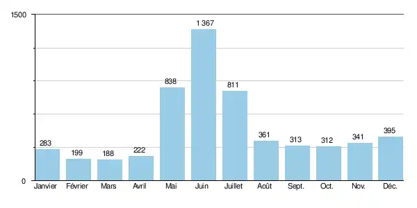 En ne considérant que la période estivale, la seule vraiment importante car libre de glaces (de mai à septembre inclus), le débit mensuel minimal observé a été de 156 m3/s en , ce qui restait très confortable, voire abondant.