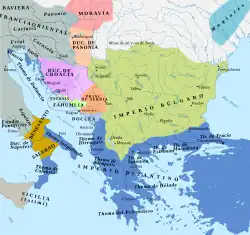 Après la bataille d'Ongal, les Proto-Bulgares s'installent de part et d'autre du Bas-Danube, dans la plaine valaque et dans l'ensemble de la Mésie, région de l'est des Balkans située au sud du Danube et peuplée en majorité de Slaves méridionaux, jusqu'alors sous domination byzantine[5].