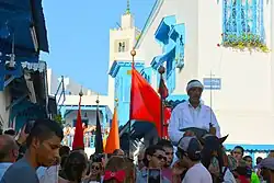 Le cortège est devancé par les porteurs de drapeaux, suivis des membres de la confrérie qui psalmodient des chants liturgiques au son des bendirs. Il quitte la zaouïa du saint et défile dans les rues de la ville. La cérémonie se termine par un cérémonial de danse mystique.