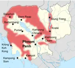 En mars 1970, à la demande des Khmers rouges, le Nord-Vietnam lance une offensive contre l'armée cambodgienne. Ils ont rapidement envahi de grandes parties de l'est du Cambodge et ont remis les zones nouvellement conquises aux Khmers rouges. L'armée cambodgienne a été décimée et 40 % du territoire cambodgien était aux mains des communistes[45],[46]. L'incurie du régime de Lon Nol, les graves difficultés économiques des paysans cambodgiens, et l'effet dévastateur des bombardements de l'US Air Force sur le pays, notamment à la frontière entre le Cambodge et le Viêt Nam, poussent un nombre croissant d'habitants des zones rurales à rejoindre les Khmers rouges[47]. Le volume de bombes déversé à l'époque sur le Cambodge par l'aviation américaine est trois fois supérieur à celui lancé sur le Japon pendant la Seconde Guerre mondiale. Des centaines de milliers de Cambodgiens sont amenés à fuir leurs villages pour se réfugier dans les forêts : à la fin de 1970, environ un million de personnes vivent dans les zones cambodgiennes contrôlées par le Việt Cộng, les troupes nord-vietnamiennes et les Khmers rouges. En 1970 et 1971, les Khmers rouges servent surtout de force d'appoint aux communistes vietnamiens actifs au Cambodge. Avec l'arrivée de nouvelles recrues, leurs troupes gagnent notablement en importance, tout en devenant très disparates, et mêlent des combattants actifs depuis le début de la guerre civile à des paysans inexpérimentés[48].
