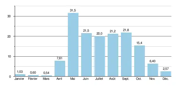 Le débit moyen mensuel observé en mars (minimum d'étiage) est de 0,54 m3/s, soit moins de 2 % du débit moyen du mois de mai (31,5 m3/s), ce qui souligne l'amplitude extrêmement élevée des variations saisonnières. Et ces écarts de débits mensuels peuvent être encore plus importants d'après les années : sur la durée d'observation de 40 ans, le débit mensuel minimal a été de 0,00 m3/s à plusieurs reprises de janvier à mars (arrêt de tout écoulement), tandis que le débit mensuel maximal s'élevait à 94,0 m3/s en .