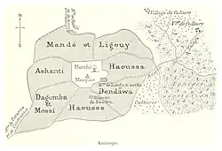 L'explorateur français Louis-Gustave Binger l'atteint le mercredi . Il y est accueilli très aimablement par l'homme le plus riche de la ville, Sâadou, qui n'en est pas pour autant le chef. Binger précise que le nom du chef est alors Mahama mais que son « pouvoir est très limité et ne s'exerce pour ainsi dire que sur ses compatriotes haoussa... »[1]. Binger décrit ensuite la ville et ses différents quartiers. Il revient sur les explorateurs qui l'ont précédé : « Kintampo, qui figure déjà dans les itinéraires rapportés par Bowdich et Dupuis sous le nom de Kantano, ne devait être à cette époque qu'un misérable village achanti où quelques Ligouy ou Mandé de Boualé venaient s'approvisionner en kolas »[2].