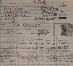 La majorité des sources mentionnent comme date de port obligatoire la Natives Registration Ordinance (Ordonnance d'enregistrement des natif) de 1920 ; toutefois certains font remonter son existence préalablement à l'établissement de la colonie kenyane, à 1915 et son port obligatoire à une ordonnance de 1919,[2],[3], voire de 1915[4]. Ce port est obligatoire pour tout homme africain souhaitant sortir de la réserve à laquelle ils a été assigné. En 1927, cette obligation est étendue à tous les domestiques, et concerne alors aussi les femmes. Le document, qui n'est dans ce cas pas porté en sautoir prend alors l'appellation populaire de « livre rouge »[5].