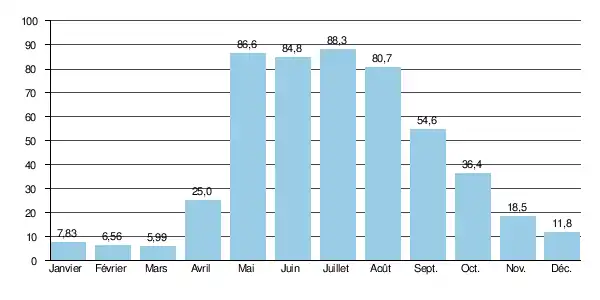 Le débit moyen mensuel observé en mars (minimum d'étiage) est de 5,99 m3/s, soit plus ou moins 7 % du débit moyen du mois de juillet (88,3 m3/s), ce qui témoigne de l'amplitude assez modérée - pour la Sibérie - des variations saisonnières. Sur la durée d'observation de 32 ans, le débit mensuel minimal a été de 3,40 m3/s en , tandis que le débit mensuel maximal s'élevait à 194 m3/s en .
