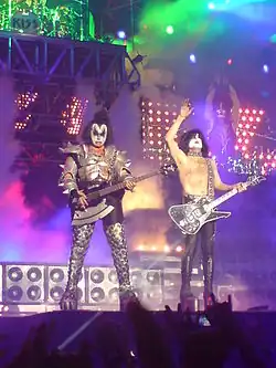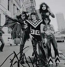 Kiss est un groupe américain de hard rock, originaire de New York. Il est formé en [2] par le guitariste Paul Stanley et le bassiste Gene Simmons. Très populaires, notamment grâce à leurs maquillages, leurs costumes extravagants, leurs nombreux effets spéciaux sur scène et la célèbre très grande langue de Gene Simmons, Kiss a vendu plus de 60 millions d'albums aux États-Unis (dont 21 millions ont été certifiés par la RIAA[3]) ; Kiss est un des groupes les plus vendeurs de l'histoire de la musique. Le groupe et ses membres en solo ont récolté 30 disques d'or, 9 disques de platine et 10 disques multi-platine pour les seuls États-Unis[4],[5]. Kiss est également connu pour ses nombreux produits dérivés qui se vendent en quantité industrielle, si bien qu'en 2006 la « marque » Kiss est évaluée à un milliard de dollars américains[6]. Kiss est ainsi l'un des plus grands groupes de hard rock et l'un des plus couronnés de succès de l'histoire de la musique. Il est également l'un des groupes précurseurs du glam metal, un genre très populaire durant les années 1980.