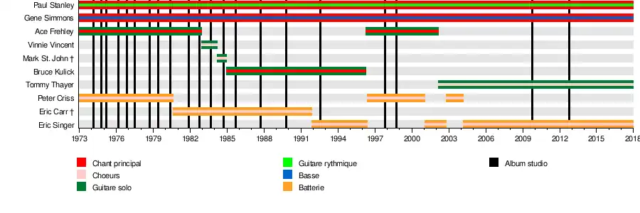 - Ace Frehley : guitare solo, chœurs, chant (1973–1982, 1996–2002)