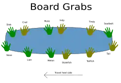 Les différents grabs : en moutarde la main arrière, en vert la main avant.