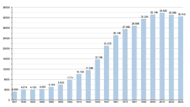 Elle comptait, au , 32 408 habitants (15 678 hommes et 16 730 femmes), soit une densité de 574,20 habitants/km²[6] pour une superficie de 56,44 km²[7].