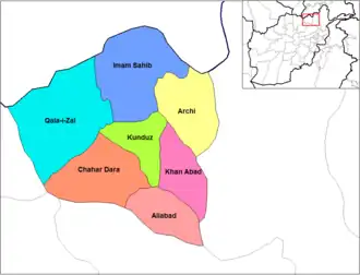 | Chahar Dara | 69 251 | 55 % Pachtounes, 25 % Tadjiks, 12 % Ouzbeks, 8 % Turkmènes |