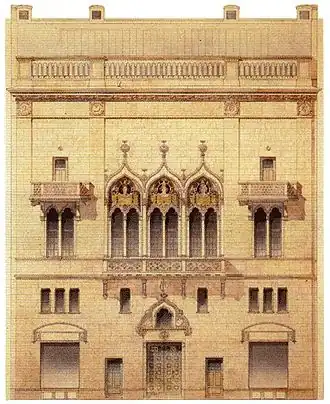 La façade donnant sur la rue est en calcaire de Portland avec des détails complexes, notamment des ouvertures murales, une balustrade de couronnement, des fenêtres à feuilles de trèfle et des mosaïques. L'architecture s'inspire des tendances italiennes et espagnoles du XVIe siècle. L'intérieur comprend le hall d'entrée, un escalier et la salle d'exposition richement stuquée. Le bâtiment abrite une collection d'œuvres d'art. L'ensemble de l'édifice est décoré par les œuvres d'artistes et d'artisans célèbres[2]. Les petits reliefs sur les portes d'entrée ont été créés par le peintre Gustaf Theodor Wallén.