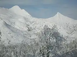 - À l'ouest, la ligne de crêtes des montagnes Monashee depuis Rossland jusqu'au lac Kinbasket.