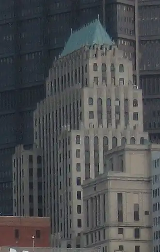 L'immeuble est revêtu de calcaire avec une base en granite poli et un toit en cuivre. Le hall d'entrée est richement décoré de marbre et comporte un haut plafond. Le toit est illuminé la nuit.