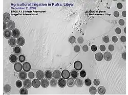 L'État libyen a lancé à Koufra, lors de la phase 3 du projet « la grande rivière artificielle » de Kadhafi (1984-2007), un projet très étendu visant à développer l'agriculture dans les milieux désertiques. Il s'agit de l'irrigation de cultures grâce aux eaux souterraines fossiles, donc non renouvelables, seules sources aquifères de la région. L'irrigation se fait au travers d'un système radial.