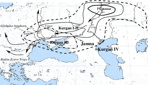 Dans un second temps, les populations de la culture de Samara se seraient répandues dans la steppe pontique, jusqu'au Dniepr, entrant ainsi en contact avec la culture de Cucuteni-Trypillia, constituée de fermiers néolithiques. L'échange de traits culturels aurait conduit au Kourgane II, s'étendant du Caucase (culture de Maïkop) jusqu'aux bouches du Danube[18].