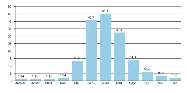 Le débit moyen mensuel observé en février-mars constitue moins de 3 % du débit moyen du mois de juillet (45,1 m3/s), ce qui souligne l'amplitude importante des variations saisonnières. Ces écarts peuvent être plus importants selon les années. Sur la durée d'observation de 33 ans, le débit mensuel minimal a été de 0,37 m3/s (en ), tandis que le débit mensuel maximal s'élevait à 73,2 m3/s en .