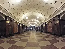 Dessinée par les architectes I. Fomine et N.N. Andrikanis, elle a des murs carrelés gris-blanc et des piliers recouverts de marbre géorgien de Shrosha, de couleur rouge foncé. C'est une station à quatre étages souterrains, l'un des deux supérieurs étant le premier à utiliser un design à trois arches et trois tunnels parallèles cylindriques. Dans ce type de station, les tubes extérieurs (abritant les rails et les plates-formes) sont séparés du hall central, plus large, par d'imposants piliers. Elle dispose d'un bâtiment extérieur en forme de coquillage, dessiné par N.A. Ladovski, situé du côté sud de Sadovoïe Koltso, le boulevard périphérique "B" de Moscou.
