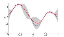 Exemple d'interpolation de données unidimensionnelles par krigeage. Les carrés rouges indiquent l'emplacement des données. L'interpolation par krigeage, représentée en rouge, suit les moyennes des intervalles crédibles normalement distribués représentés en gris. La courbe en pointillé montre une spline qui est lisse, mais qui s'écarte de manière significative des valeurs attendues données par ces moyennes.