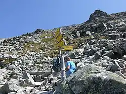 jusqu'au lac de Jamské pleso à partir duquel ils doivent suivre le chemin balisé en bleu jusqu'au sommet. Le dénivelé total de cette voie est d'environ 1 150 mètres[20].
