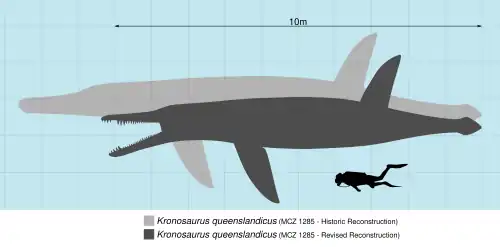 D'autres spécimens ont reçu des estimations corporelles bien que certains d'entre eux ne soient connus qu'à partir de restes fossiles plus limités[N 6]. Le spécimen holotype, QM F1609, bien que très fragmentaire, aurait mesuré 5,9 m de long pour une masse corporelle de 1,9 tonne. Le spécimen néotype proposé QM F18827 aurait atteint une longueur de 8,9 m pour une masse corporelle de 6,7 tonnes[73]. Le spécimen attribué le plus complet connu, QM F10113, aurait quant à lui atteint des mensurations légèrement plus petites, à savoir 8,6 m de long pour une masse corporelle de 5,7 tonnes[74]. Les plus grands spécimens de Kronosaurus découverts dans la formation de Toolebuc, QM F2446 et QM F2454, auraient atteint des mensurations quasi-identiques à celles du squelette d'Harvard[75]. Respectivement, ces deux spécimens auraient atteint 10,2 à 10,5 m de long pour des masses corporelles estimées de 9,9[73] à 15,5 tonnes[76].