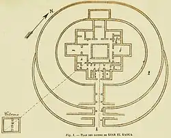 En entrant dans le vaste couloir qui conduisait à la grande porte, on trouve sur la droite encastré dans le mur une pierre portant en relief une tête de bœuf ou d'antilope sculpté, (aujourd'hui, la pierre est disparue des ruines)[5]. À l'angle nord, se trouvent deux pièces, l'une d'elles est une salle de bain avec une baignoire. Dans l'angle sud-est de ce couloir, se trouve une sculpture de la chasse à la gazelle signalée par le capitaine Marchand[2], (aujourd'hui, la pierre est disparue des ruines)[5].