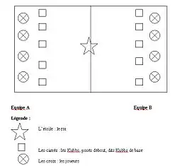 Les deux équipes se font face. Le nombre de joueurs dans chaque équipe est de six au maximum. Il y a deux phases dans le tour de chaque équipe :