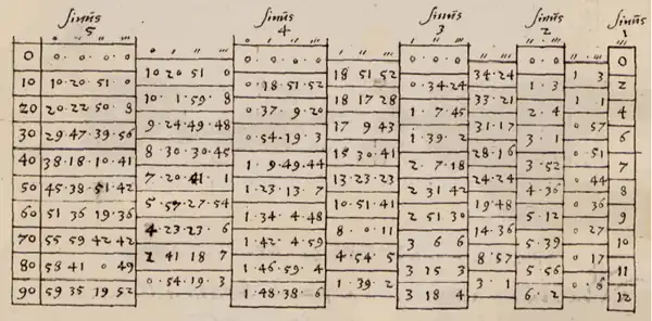 Sur ce document original de Bürgi, les nombres sont exprimés dans le système sexagésimal, ce qui rajoute une petite difficulté à son interprétation. Les angles dont on veut calculer les sinus se trouvent dans la colonne la plus à gauche du tableau.