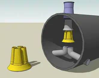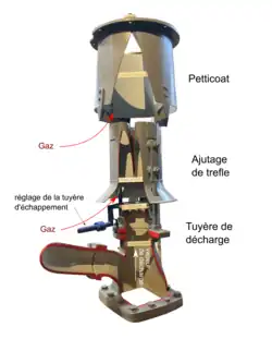 La vapeur déchargée des cylindres passe par une buse placée au fond de la chambre de fumée. Au-dessus de cette buse se trouve une buse Kylälä de forme spéciale, qui dirige le jet de vapeur vers quatre buses convergentes, dont la section rappelle un trèfle à quatre feuilles. Au-dessus, comme il est d'usage sur les locomotives américaines, est disposé un autre anneau, le peticoat, que Chapelon a fait breveter. Cet enchaînement de buses convergentes favorisait la circulation du mélange vapeur/gaz de combustion dans la boîte à fumée et la répartition uniforme de la dépression sur l'ensemble du faisceau tubulaire, ce qui favorisait une combustion plus forte et homogène[1].