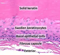 - ↑ Anne Elizabeth Laumann, « Which histologic findings are characteristic of trichilemmal cyst (pilar cyst)? », Medscape