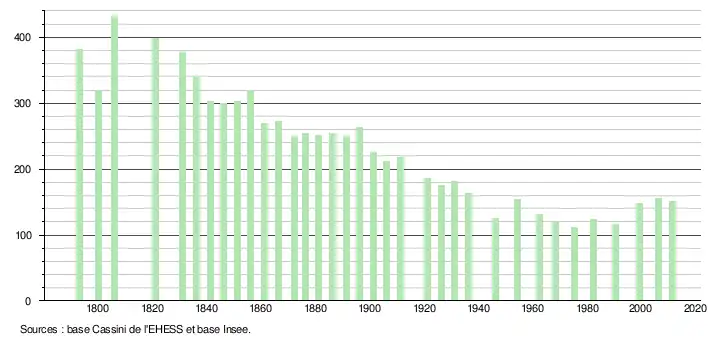 L'évolution du nombre d'habitants est connue à travers les recensements de la population effectués dans la commune depuis 1793. À partir du , les populations légales des communes sont publiées annuellement dans le cadre d'un recensement qui repose désormais sur une collecte d'information annuelle, concernant successivement tous les territoires communaux au cours d'une période de cinq ans. Pour les communes de moins de 10 000 habitants, une enquête de recensement portant sur toute la population est réalisée tous les cinq ans, les populations légales des années intermédiaires étant quant à elles estimées par interpolation ou extrapolation[13]. Pour la commune, le premier recensement exhaustif entrant dans le cadre du nouveau dispositif a été réalisé en 2006[14],[Note 2].