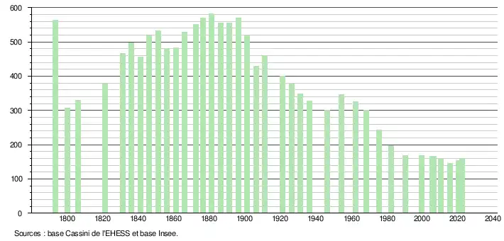 | L'évolution du nombre d'habitants est connue à travers les recensements de la population effectués dans la commune depuis 1793. Pour les communes de moins de 10 000 habitants, une enquête de recensement portant sur toute la population est réalisée tous les cinq ans, les populations de référence des années intermédiaires étant quant à elles estimées par interpolation ou extrapolation[27]. Pour la commune, le premier recensement exhaustif entrant dans le cadre du nouveau dispositif a été réalisé en 2005[28]. En 2022, la commune comptait 161 habitants[Note 4], en évolution de +12,59 % par rapport à 2016 (Tarn : +2,52 %, France hors Mayotte : +2,11 %). |