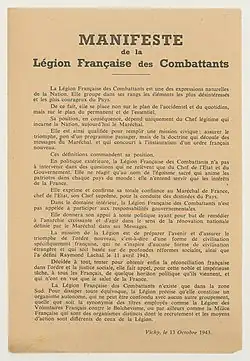 La loi du transforma la Légion initiale en « Légion française des combattants et des volontaires de la Révolution nationale », de façon à y inclure les partisans du régime qui n'avaient pas combattu. L'ancien député Raymond Lachal en devient directeur général en , succédant à François Valentin, qui rejoindra les rangs de la Résistance française. À son apogée, la LFC atteindra un chiffre de 900 000 adhérents en métropole, 500 000 outre-mer auxquels s'ajouteront 350 000 volontaires de la Révolution nationale[15].