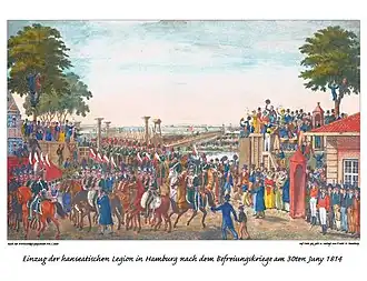 Au cours du congrès de Vienne (du au ), certains États, dont la Bavière et le Wurtemberg, s'opposent au rétablissement des villes de Brême, Hambourg et Lübeck comme États indépendants au motif qu'elles avaient été annexées au territoire français : il leur est répondu que la Légion hanséatique a été reconnue comme partie d'un corps d'armée allié, ce qui équivaut indirectement à une reconnaissance d'indépendance[4]. Les trois villes resteront des États souverains, membres de la Confédération germanique, jusqu'à leur incorporation dans l'Empire allemand en 1871.