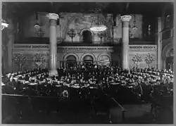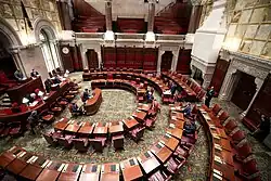 Les hémicycles de l'Assemblée et du Sénat de l'État de New York, vus en 1913 et 2020, respectivement. | ||