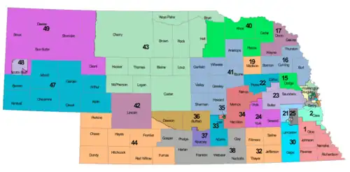 La législature du Nebraska comprend 49 sénateurs, élus pour 4 ans et dont les sièges sont renouvelables par moitié tous les deux ans. Chaque sénateur représente un district général de 35 000 électeurs.
