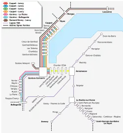 | Lignes | 6 lignes (de type R CFF/TER SNCF) + 1 ligne RE CFF de Annemasse à Vevey ou Saint-Maurice via Lausanne | |