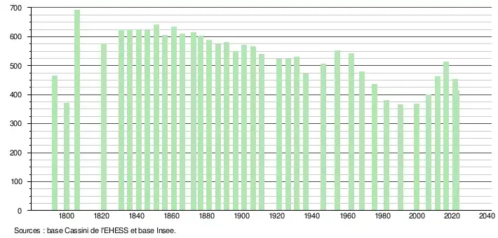 L'évolution du nombre d'habitants est connue à travers les recensements de la population effectués dans la commune depuis 1793. Pour les communes de moins de 10 000 habitants, une enquête de recensement portant sur toute la population est réalisée tous les cinq ans, les populations de référence des années intermédiaires étant quant à elles estimées par interpolation ou extrapolation[26]. Pour la commune, le premier recensement exhaustif entrant dans le cadre du nouveau dispositif a été réalisé en 2006[27].