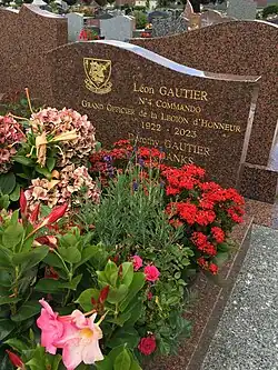 Léon Gautier meurt le , à l'âge de 100 ans, des suites d'une infection pulmonaire, quelques jours après avoir été hospitalisé à Caen[12]. Une cérémonie d'honneurs militaires a lieu à Ouistreham le , présidée par le président de la République, Emmanuel Macron, lequel salue « la légende d'un homme ordinaire devenant héros »[13]. Léon Gautier est ensuite inhumé au cimetière de Ouistreham[14].