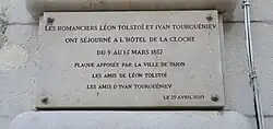 Aussi au cours de son errance, il séjournera, en mars 1857, avec son ami Tourguéniev à l'hôtel de la Cloche à Dijon.